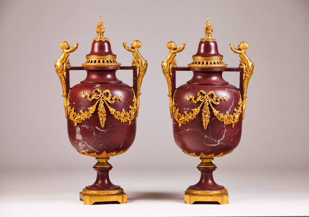 - Lote 423: Par de Urnas estilo Luís XV, séc.XIX. Urnas em mármore e bronze dourado, pegas decoradas com putti em vulto perfeito, corpo central decorado com festões de grinaldas e tampas decoradas com representação de fogo. Peça bem executada, com muitos pormenores e com diálogo entre os elementos: os putti estão numa posição sugestiva de estarem a aquecer as mãos no fogo. Base de licitação: € 12,000.